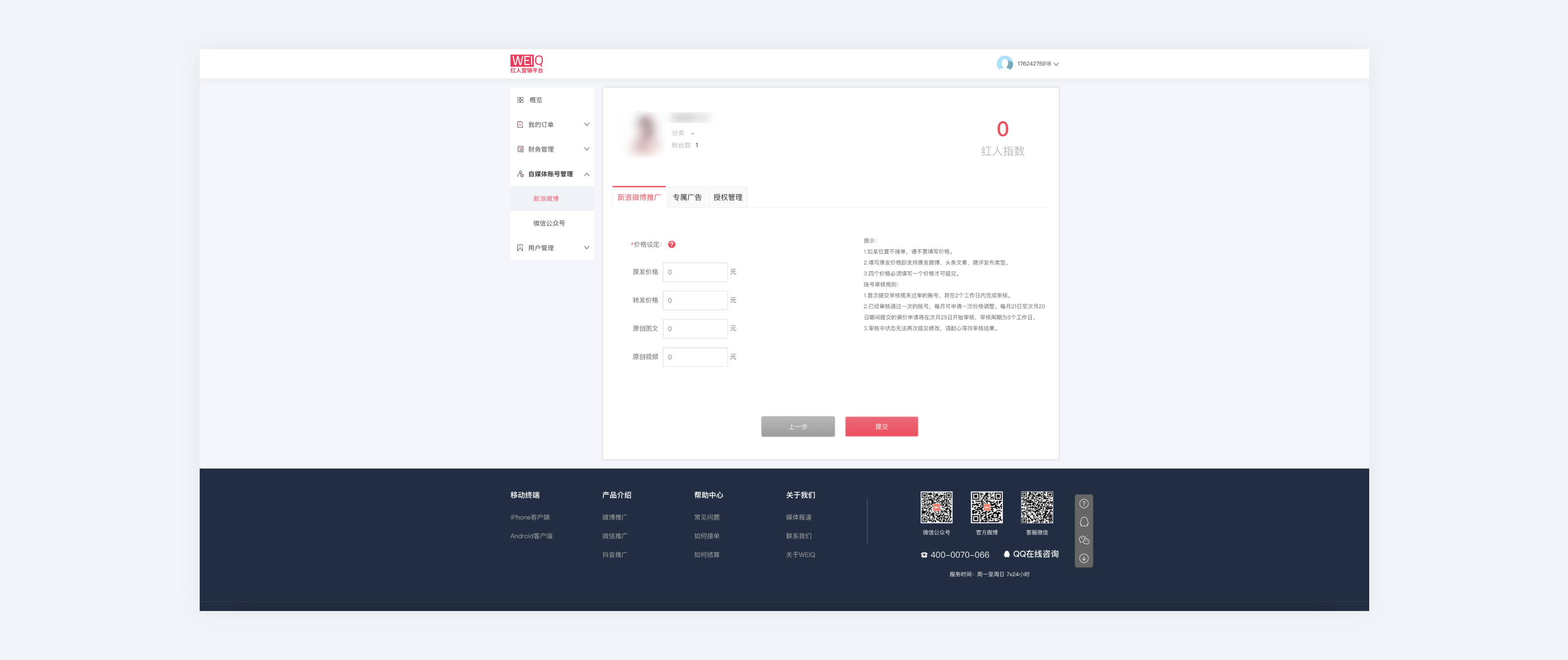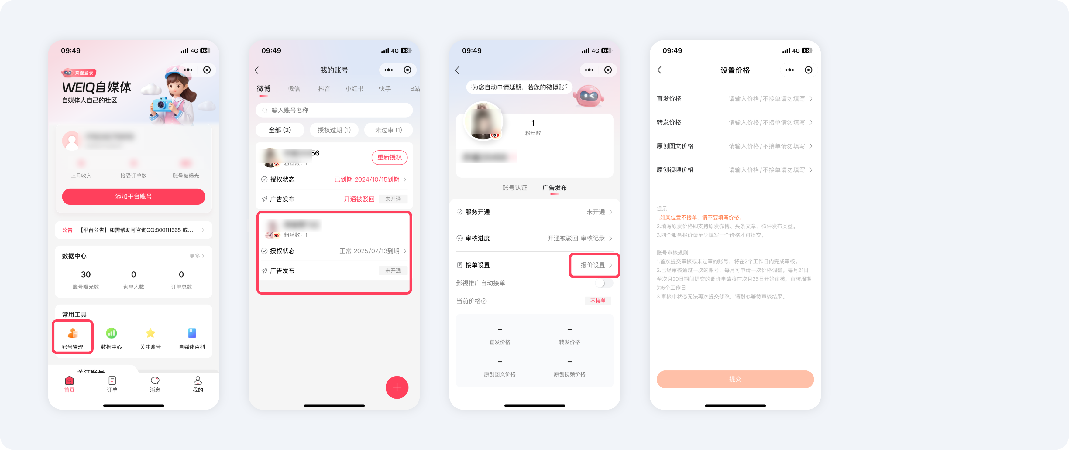- 您也可以进入【自媒体账号管理】,点击【微博】选择账号点击进入账号详情提交价格。